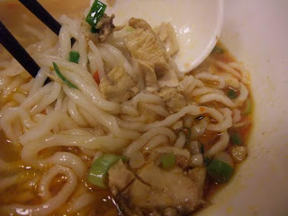 招牌砂鍋紹子米線氣勢澎湃,不像前述二款採用較深器皿,使湯麵略顯小家子氣:P 鍋內小山由豬肉片、紅蘿蔔與木耳絲組成,別以為廚師作手腳把食材堆高高,筷子稍一番攪才發現整鍋滿滿滿都是米線,難怪豬肉片如此